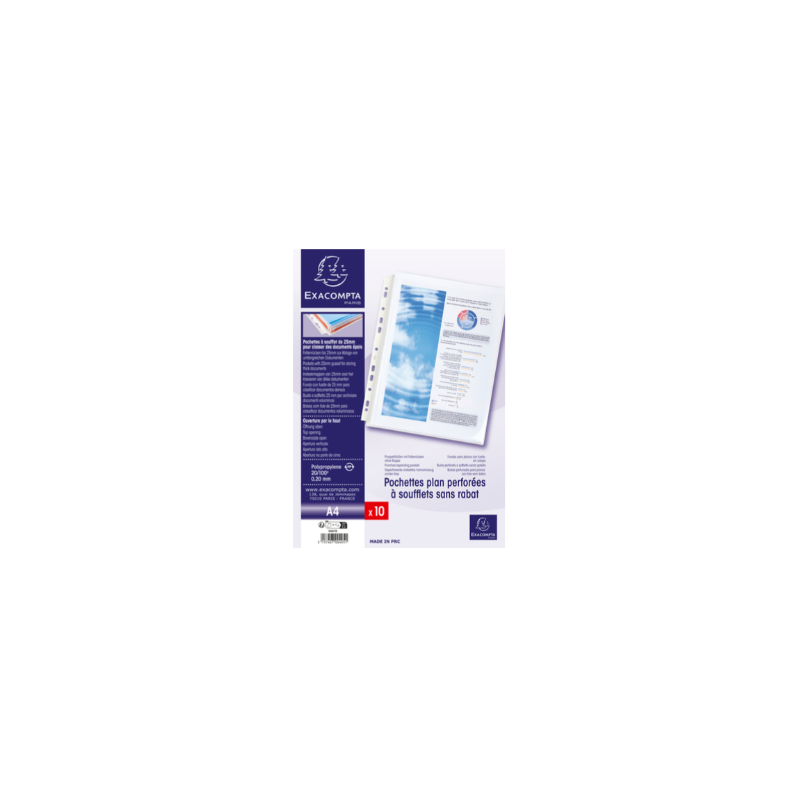 Sachet de 10 pochettes perforées à soufflet, sans rabat, format 21×29,7 cm. En polypropylène 20/100ème. Idéal pour le classement.
